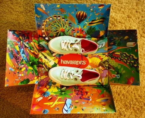 Hoje eu recebi dos Correios uma caixa de papelão com dois selos que diziam “Pronto para Usar” e “Não dê um passo sem abrir”. Quando abri, a parte de baixo da caixa era toda estampada e tinha um lançamento da Havaianas: Soul Collection, um tênis lindo azul piscina, com ilhóses. O mais legal é que a “palmilha” é uma Havaiana! Como se tivessem colocado o chinelo lá dentro. Eu adorei a novidade. Não encontrei no site deles, mas em breve deve chegar às lojas. Gostou?