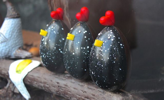 Você vai reparar em uma das fotos tem algumas galinhas de chocolate. Isso porque em vez de coelho, o símbolo da Páscoa na França é a galinha, afinal, é ela que bota ovos.