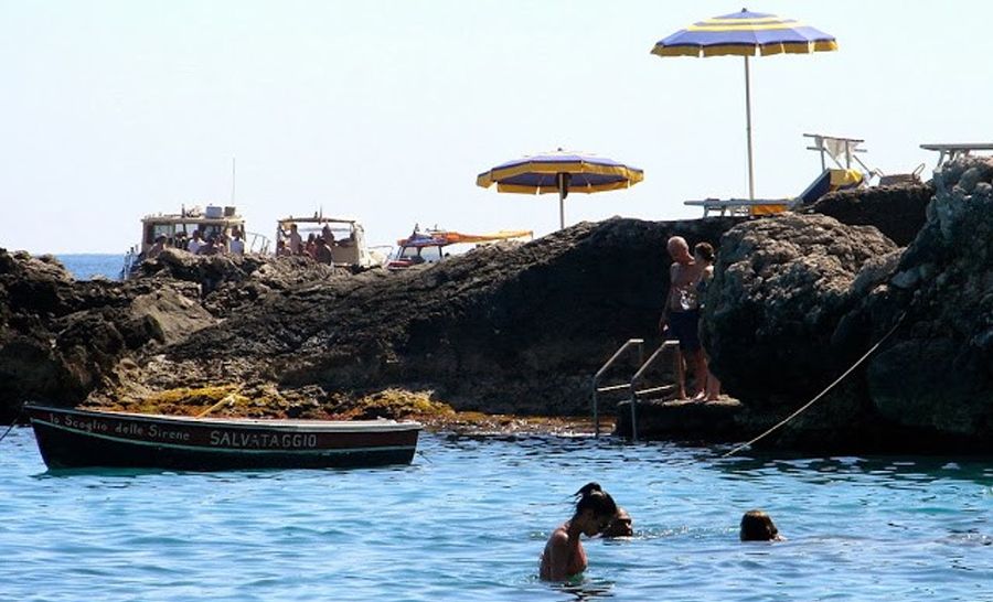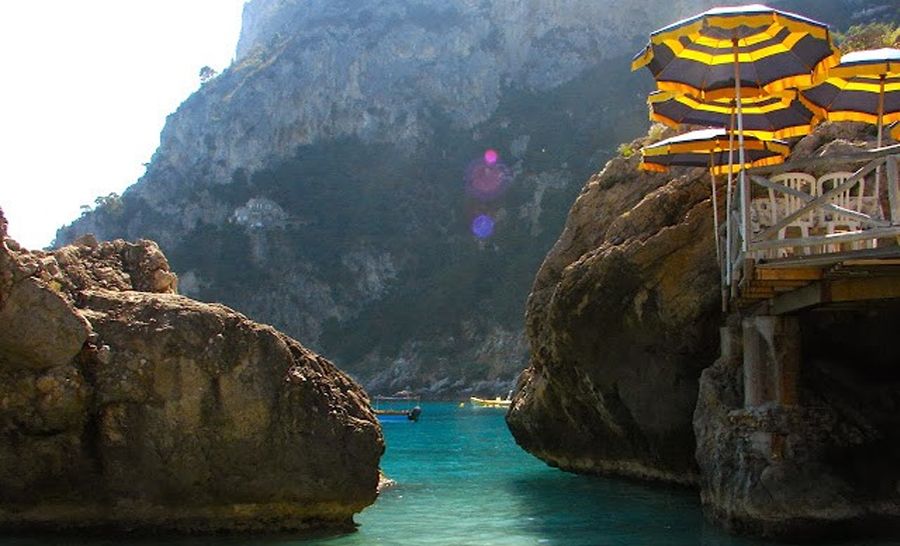Procurávamos uma praia menos turística e encontramos Bagno Regina Giovanna. Frequentada praticamente apenas por italianos que fogem pra lá por ser um reduto um pouco fora do circuito turístico, está a mar aberto e tem uma vista espetacular de 180 graus do Vesúvio à Sorrento. E é free… A praia, que não é bem uma praia, é na verdade um sítio arqueológico: uma antiga vila romana, Villa Pollio Felice, que pertencia a húngara Regina Giovanna D’Anjou (1371-1435), rainha de Nápoles. Por sua conduta “escandalosa” – ela tinha o hábito de se banhar naquelas águas, nua, com seu amante – ficou conhecida como Bagno Regina Giovanna. As ruínas estão lá ainda e infelizmente bem abandonadas. Banho de Sol e de mar lá, só à moda antiga – sem cabines ou espreguiçadeiras. Não vimos ninguém nu (!).