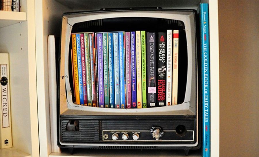 Decore – hoje já demos uma dica de décor com garrafas de vinho, viram? Mas existem varias opções super charmosas como essa da foto, de adaptar uma televisão velha para guardar seus livros. Amei!