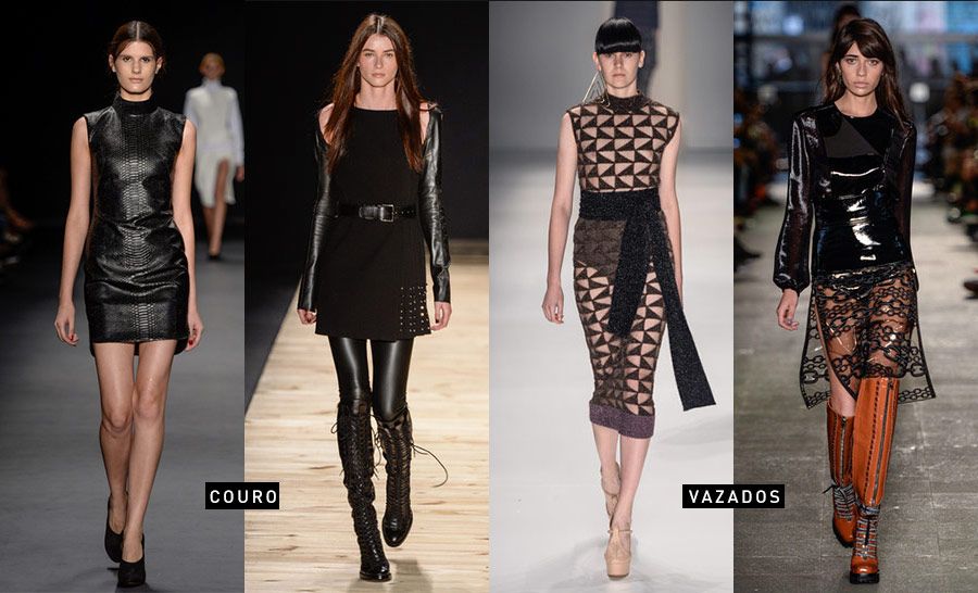 Os tecidos com tramas, couro recortado, tiras de tecido ligadas por argolas e costuras grosseiras, tricô transparente, são must-have. Em contraponto com o couro e os materiais mais pesados do inverno, eles emprestam sua leveza e tornam as produções muito mais fresh. Onde: Lolitta, Osklen, Giuliana Romanno, Acquastudio, Wagner Kallieno, Ellus.
