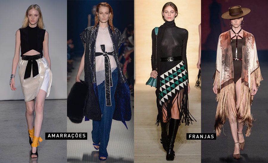 Com perfume oriental, as amarrações foram presentes em diversos desfiles. Bem ao estilo gueixa, em camisas e vestidos transpassados, ou como faixas para delinear a cintura (obi), elas casam muito bem com os bottoms retos e as calças por baixo dos vestidos. Onde: Vitorino Campos, Lollita, Osklen, Pedro Lourenço.