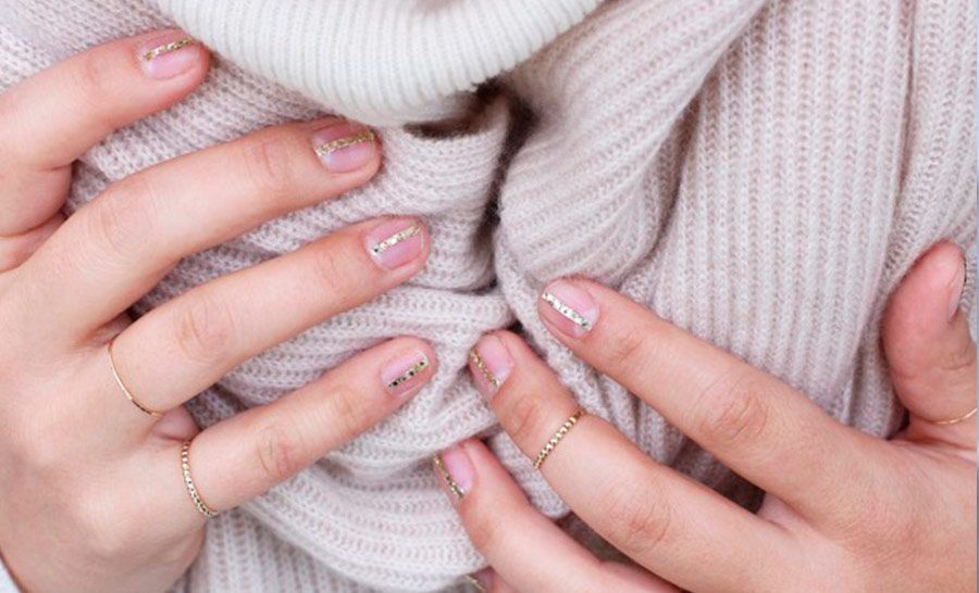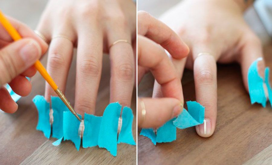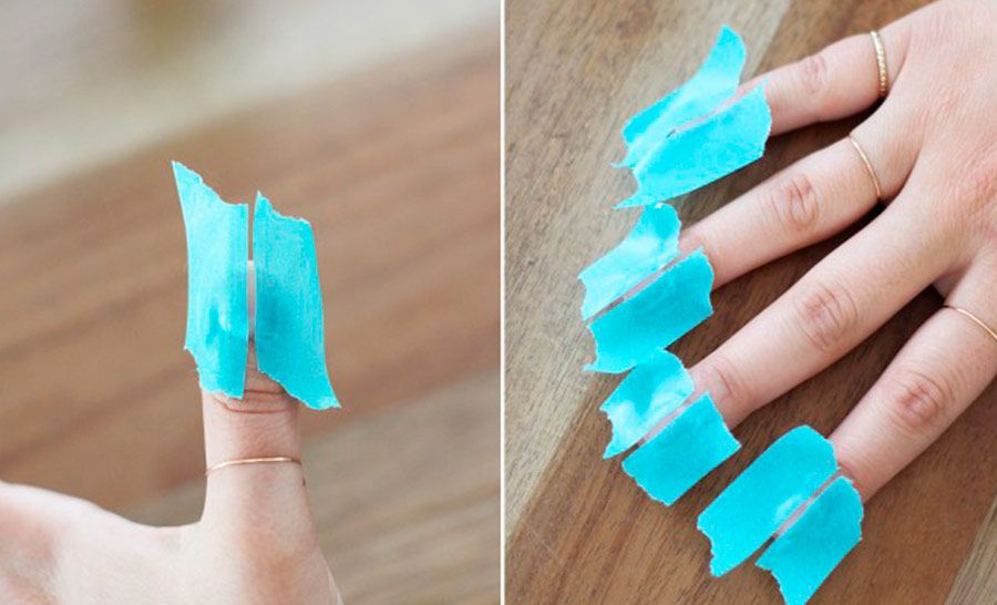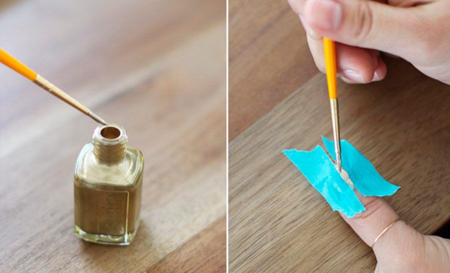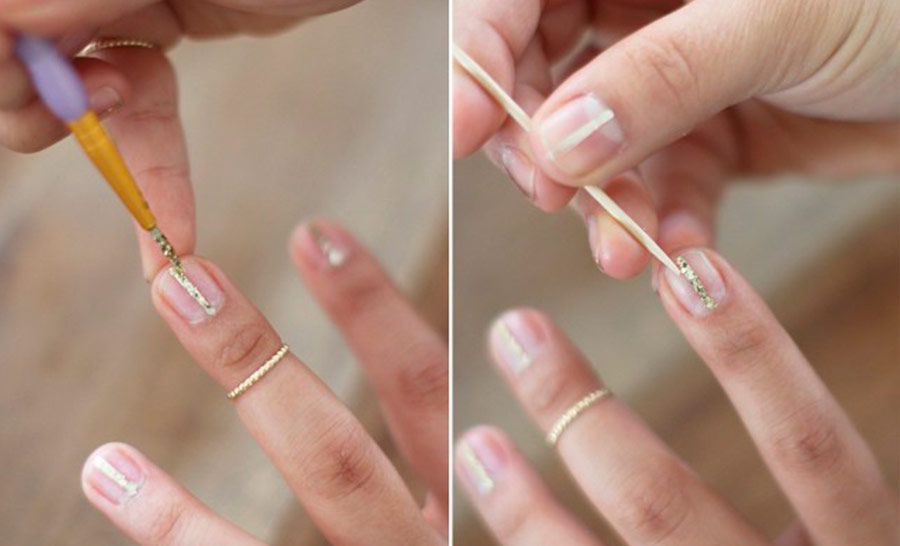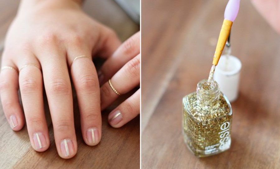 Primeiro coloque dois pedaços de fita adesiva em cada unha, de forma a deixar um linha vertical livre entre as fitas. Pinte as unhas com o esmalte metálico dourado neste espaço vertical, se desejar use um pincel de ponta fina para garantir que apenas o meio fique pintado e o esmalte não vaze para as laterais.