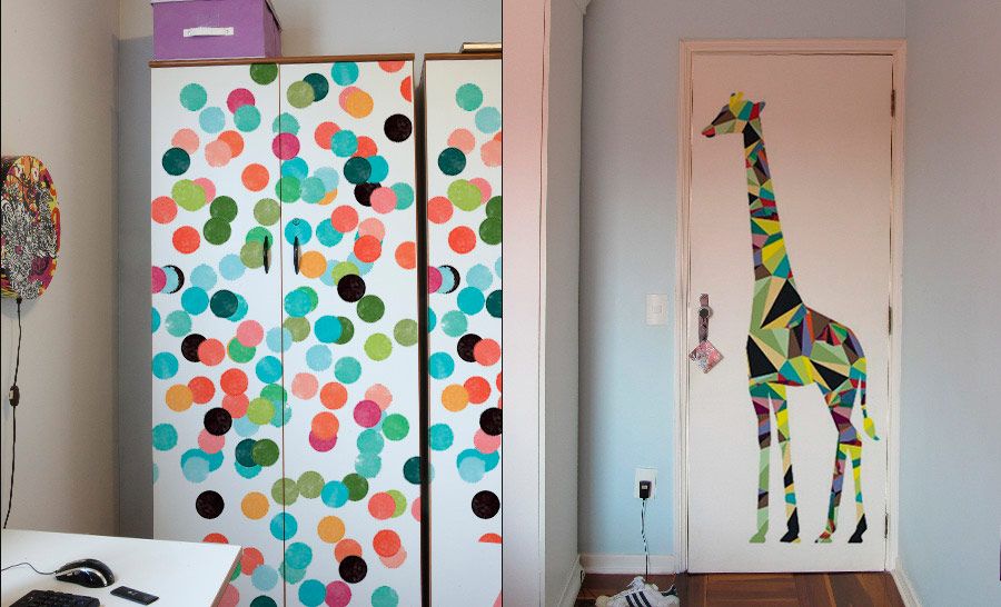 As portas podem se transformar em um grande atrativo da casa, sabia? Por ter superfície geralmente lisa, ela te permite pintar, revestir com papel vinílico ou aplicar adesivos. Aqui, pegamos um exemplo de uma cliente da Kola que colocou o adesivo Girafis do lado de dentro da porta.