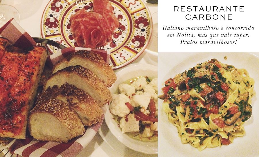 Terminamos o dia com um jantar de despedida no super disputado Carbone. Tem que fazer reserva, gente! Marcamos para às 22h30 e mesmo assim esperamos 1h no balcão – pelo menos os drinks foram por conta de casa. Italiano com decoração linda, ambiente pequeno e aconchegante, staff lindo e educado e pratos deliciosos! Ai, que saudade… Pedimos presunto de parma de entrada e estava de comer de joelhos. Rs! Meu fetuccini com funghi também estava demais. Top! A Naomi Campbell estava lá…