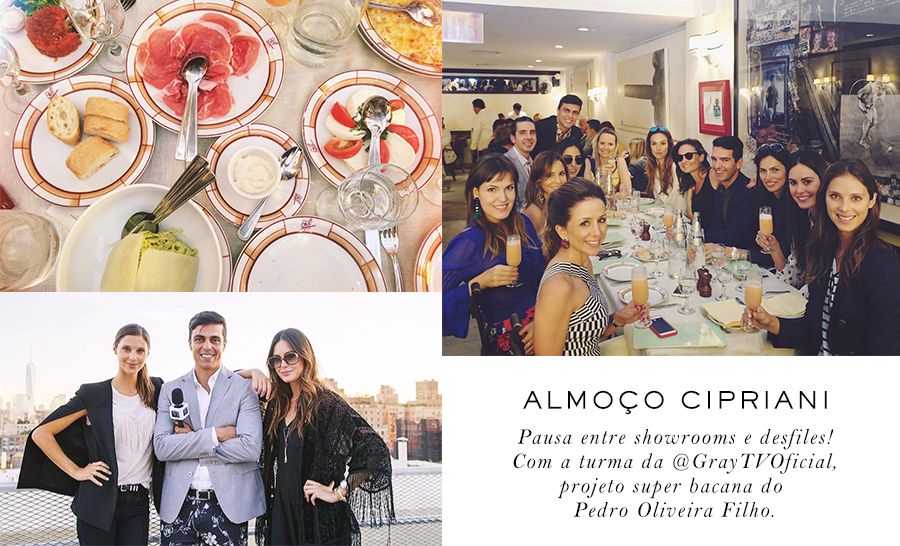 Seguimos para o Cipriani, no SoHo para um almoço oferecido pelo GrayTVOficial para nós. É um canal digital no qual as apresentadoras são modelos e os assuntos variam de moda, beleza, cinema, gastronomia… Show! Por lá, além do time Caras Blogs, Paula Martins, Alina Gonçalves, Lilian Pieroni, Rafa Mendonça, Marina Theiss e Gabi Rebeschini. Simplesmente amo este restaurante! Tudo de lá é maravilhoso… Vale super a pena!