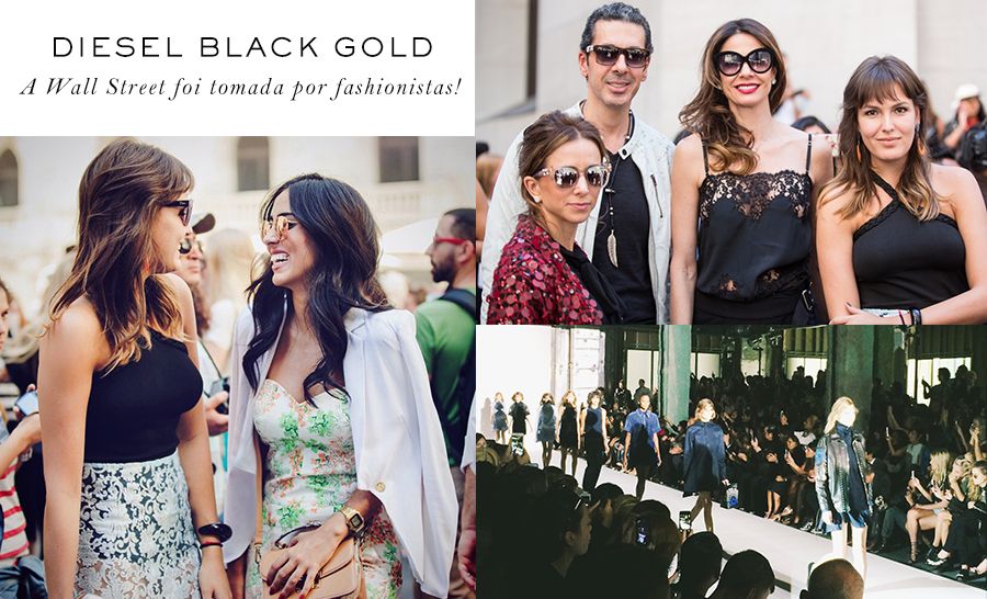 A maratona continua e corremos para não perdermos um dos desfiles mais disputados da semana e também com muuuuuitos famosos – o da Diesel Black Gold. Aconteceu em Wall Street e teve couro, jeans, peças com recortes e assimetria, tramas que deixavam o corpo a mostra, ilhoses e toques esportivo, bem o DNA da marca.