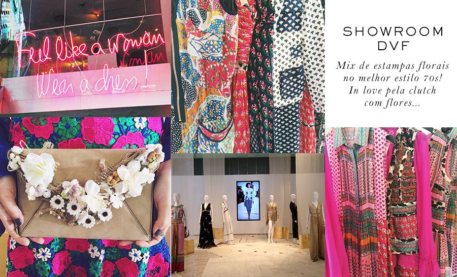 O prmeiro compromisso do dia foi uma visita ao showroom da DVF em Meatpacking para o re-see da coleção, isso é: ver de pertinho, nas araras, o que havia sido desfilado no dia anterior. Meus Deus, quanta coisa linda! A Diane fez um mix incrível de estampas florais, algumas com detalhes em onça também como um patchwork dos anos 70! Também vimos dourado com efeito lamê e peças em preto e nude com bordados em borboletas. Super lúdico! Aliás, amei a clutch com flores, as mesas que enfeitaram os cabelos das modelos na passarela.
