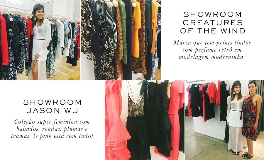 Passamos pelo hotel para nos arrumarmos e seguimos para os showrooms do Jason Wu e da Creatures of the Wind. Como eu disse, adoro poder conferir de pertinho os tecidos, os cortes, os detalhes… Acho até mais legal do que os desfiles! O Jason tem uma estética mais reta e clean, mas elegeu o babado para várias peças desta coleção – meus favoritos são o vestido longo verde com este detalhe e o vestido tipo camisola com renda e plumas… Já a Creatures faz peças bem originais com um toque vintage que eu adoro e muito mix de estampas e texturas. Minhas peças favoritas foram o vestido de seda com veludo devorê e o vestido tubinho preto longo com manga estampada.