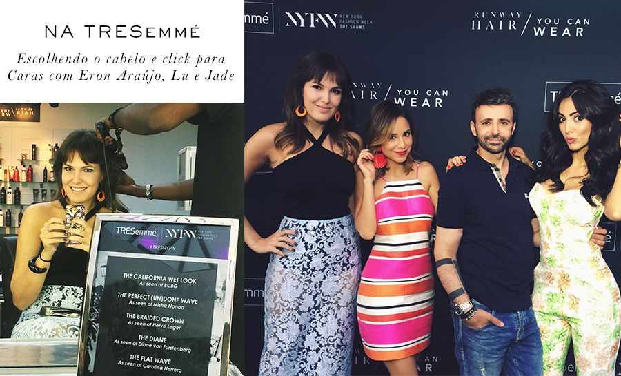 Corremos para o espaço da TRESemmé, patrocinadora oficial da NYFW para nos encontrarmos com o top hairstylist Eron Araújo e conferir os lançamentos da marca. Lá podíamos escolher um dos penteados desfilados nos dias anteriores – fiz post completinho aqui. Fizemos umas fotinhos que saíram na Caras da semana passada. Quem viu?
