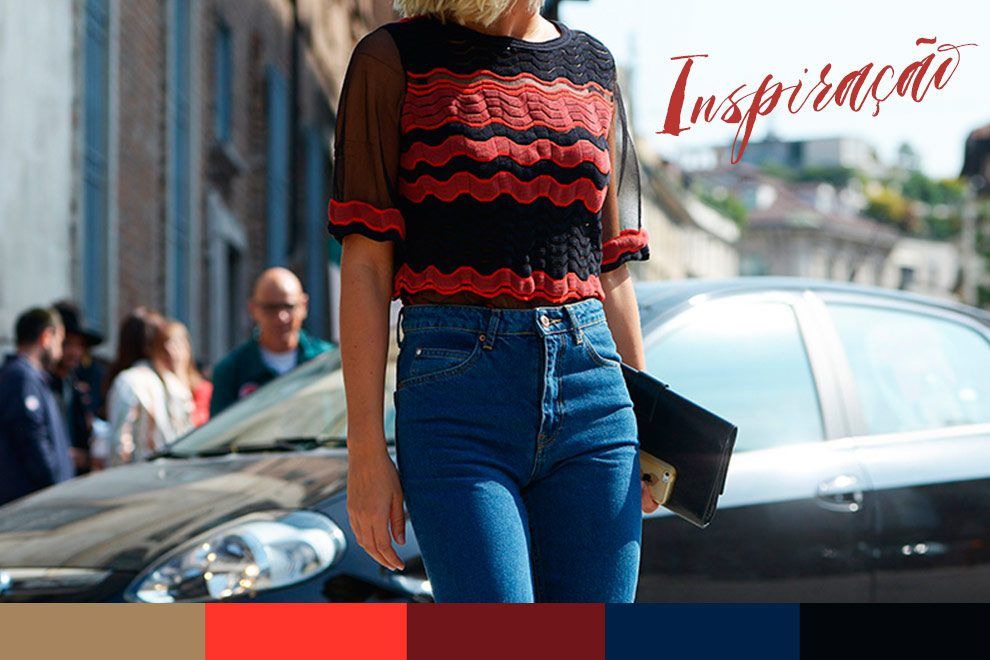 A calça de cintura alta deixa o look com carinha de anos 70, mas a barra desfeita traz um quê super atual e moderninho à peça. A camiseta em zigzag com leve transparência nas mangas é coringa e trouxe uma corzinha para o jeans basicão.