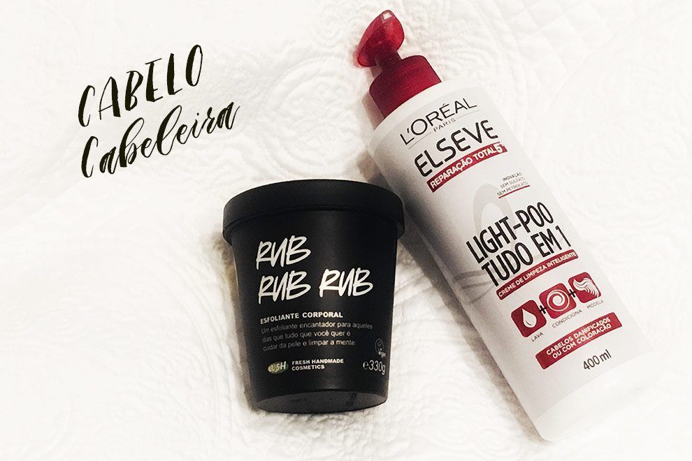 O primeiro é o Rub Rub Rub, da Lush, um gel de banho esfoliante com cheiro maravilhoso, que também pode ser usado para lavar e dar volume e brilho aos cabelos. Ele é feito com sal marinho rico em minerais, antisséptico natural e que, combinado com suco de limão, deixa os cabelos volumosos e brilhantes. Uso só no couro cabeludo para não ressecar as pontas e ele fica levinho, bem solto na raiz.