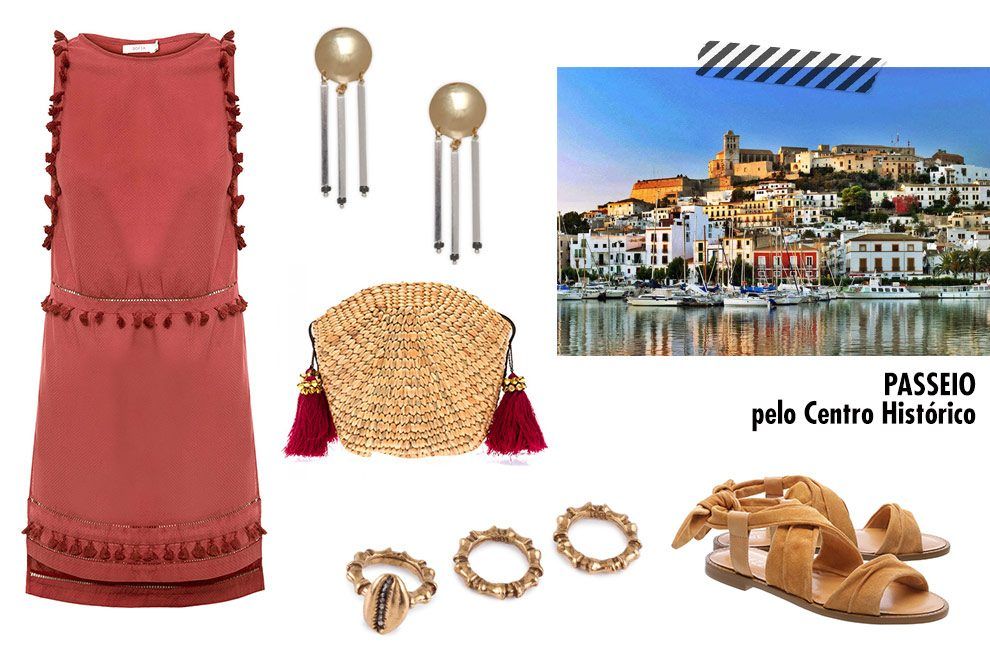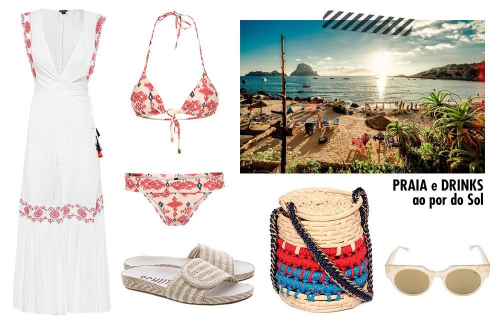 Praia: Com vibe bem descolada e estilo hippie chic, as praias de Ibiza ficam cheias desde cedo até a tarde, com música, bebidas e muito agito. O acompanhamento ideal para seu biquíni a pedida é a saída de praia solta, com bordados ou pompons. Escolhemos uma capa longa que, se amarrada em estilo wrap, fica parecendo um vestido, ótima opção caso deseje ir da praia direto para o almoço. Nos pés, slides confortáveis, óculos de Sol não podem faltar e a bolsinha de palha garante charme extra à produção.