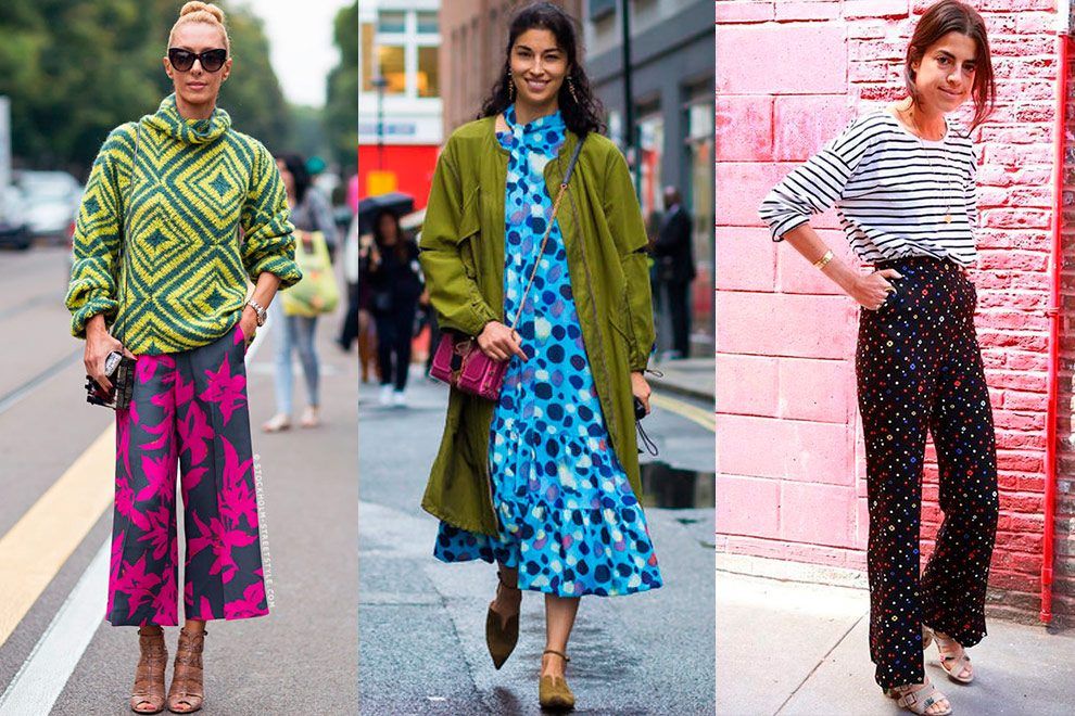 Na segunda montagem temos uma explosão de cor. Reparem como no primeiro look o elemento que conecta as duas peças de estampas completamente diferentes – que aparentemente não funcionariam juntas – é o tom verde acinzentado, presente em ambas. A-do-ra-mos! E que tal tirar aquele vestido de verão do armário? Jogue um casacão militar por cima e o look fica muito mais interessante instantaneamente – queremos usar já, ótima opção para os dias em que o Sol aparece, mas as vezes bate aquele ventinho. Agora, se quiser apostar numa mistura de estampas clássica e certeira, vá de listras com bolinhas. Não tem nada mais fofo do que esse look da nossa musa Leandra Medine, com camiseta de listras básica e calça com bolinhas miúdas e coloridas. É muito amor!