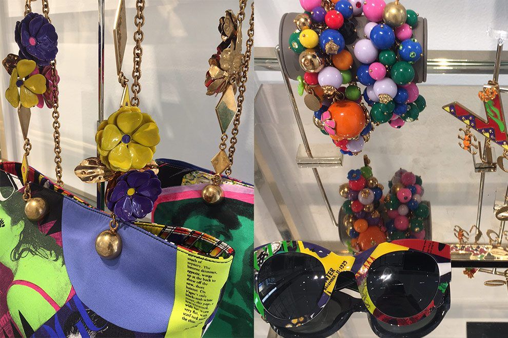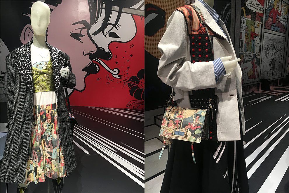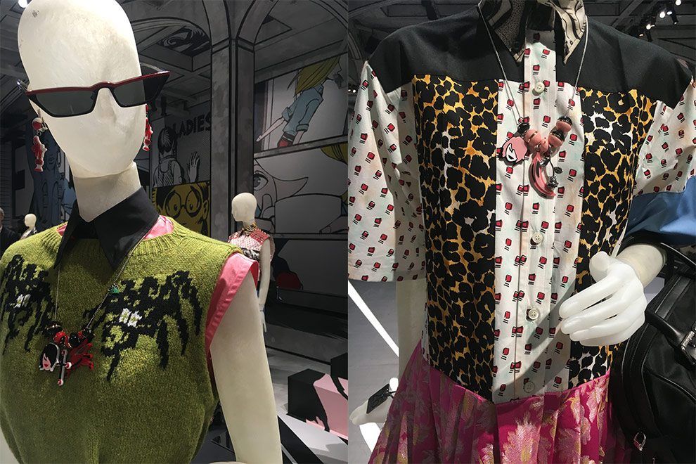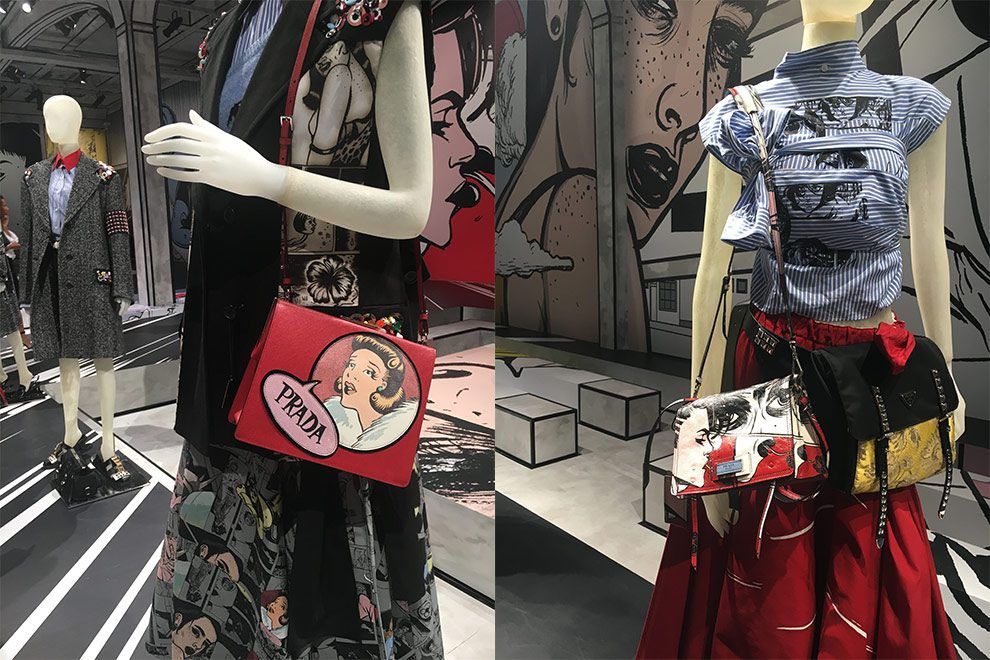 Comecei com a Prada, que vem uma coleção inspirada no “poder” da mulher, contada de forma sutil, com quadrinhos. Isso mesmo, revista em quadrinhos! Em todo o ambiente a gente via imagens enormes criadas por diferentes artistas que ilustravam situações do cotidiano das mulheres de forma lúdica, às vezes com provocações e outras mais divertidas. Peças do vestuário masculino foram muito presentes fazendo contraponto com estampas, cores e acessórios bem femininos. O fim dos anos 80/90 vem nas peças em xadrez, com cintura baixa, algo que remete a Nirvana e bandas da época. Adorei os óculos gatinho, as bijoux com vários pingentes lúdicos divertidos e as bolsas, claro, com seus patches.